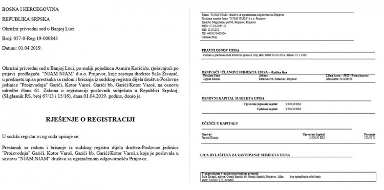 U tim rješenjima se, pored podataka o vrsti djelatnosti, sjedištu firme, registarskom broju, osnivačkom kapitalu i slično, nalaze kućne adrese osnivača i odgovornih lica te brojevi njihovih ličnih karata i pasoša.
