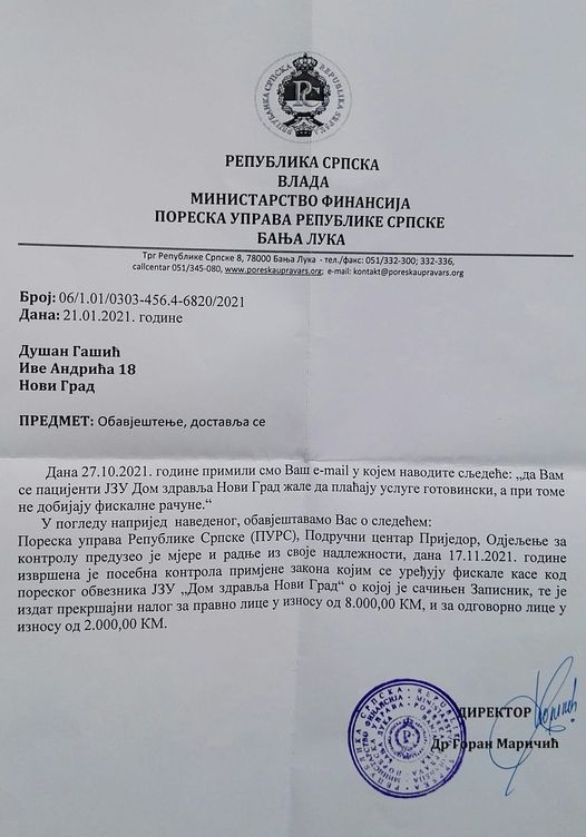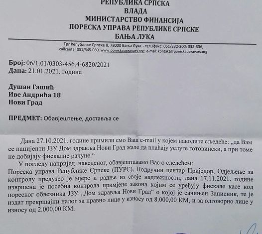 Poreska uprava RS područni Centar Prijedor Odjeljenje za kontrolu je 17. 11. 2021. izvršio posebnu kontrolu primjene Zakona kojim se uređuju fiskalne kase kod Poreskog obveznika JZU “Dom zdravlja Novi Grad” o kojoj je sačinjen zapisnik, te je izdat prekršajni nalog za pravno lice u iznosu od 8.000 KM i za odgovorno lice u pravnom licu u iznosu od 2.000 KM – navedeno je u odgovoru koji je potpisao direktor Poreske uprave RS Goran Maričić.