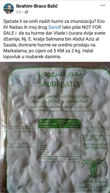 “Sjećate li se onih naših hurmi za imunizaciju? Evo ih! Našao ih moj drug Sanid! Iako piše NOT FOR SALE i da su hurme dar Vlade i čuvara dvije svete džamije, Nj. E. kralja Salmana bin Abdul Aziz al Sauda, donirane hurme se uredno prodaju na Markalama, po cijeni od 5 KM za 2 kg. Halal lopovluk u mubarek danima.” – napisao je izvjesni Ibrahim Balić.