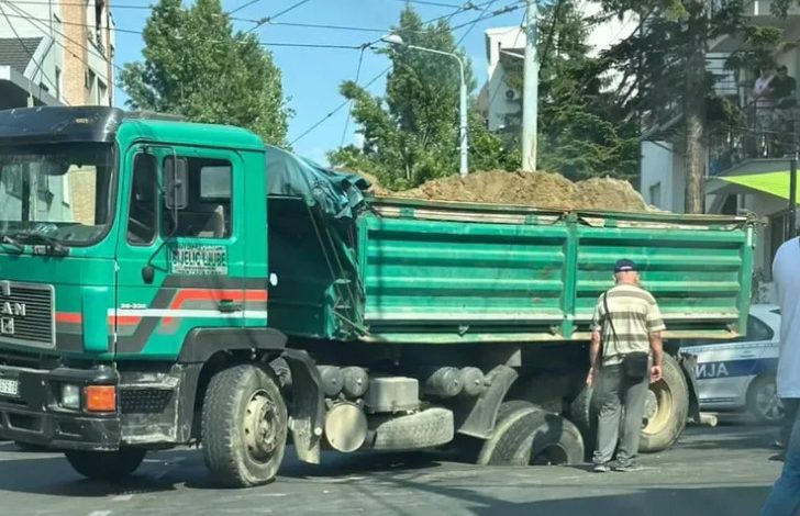 U Beogradu, u ulici Gospodara Vučića, kamion koji je prevozio pijesak jednim dijelom je propao kroz asfalt.