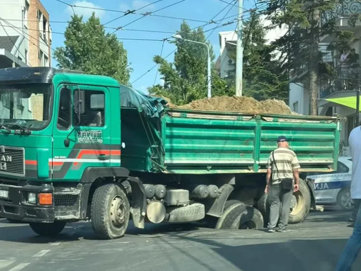 U Beogradu, u ulici Gospodara Vučića, kamion koji je prevozio pijesak jednim dijelom je propao kroz asfalt.