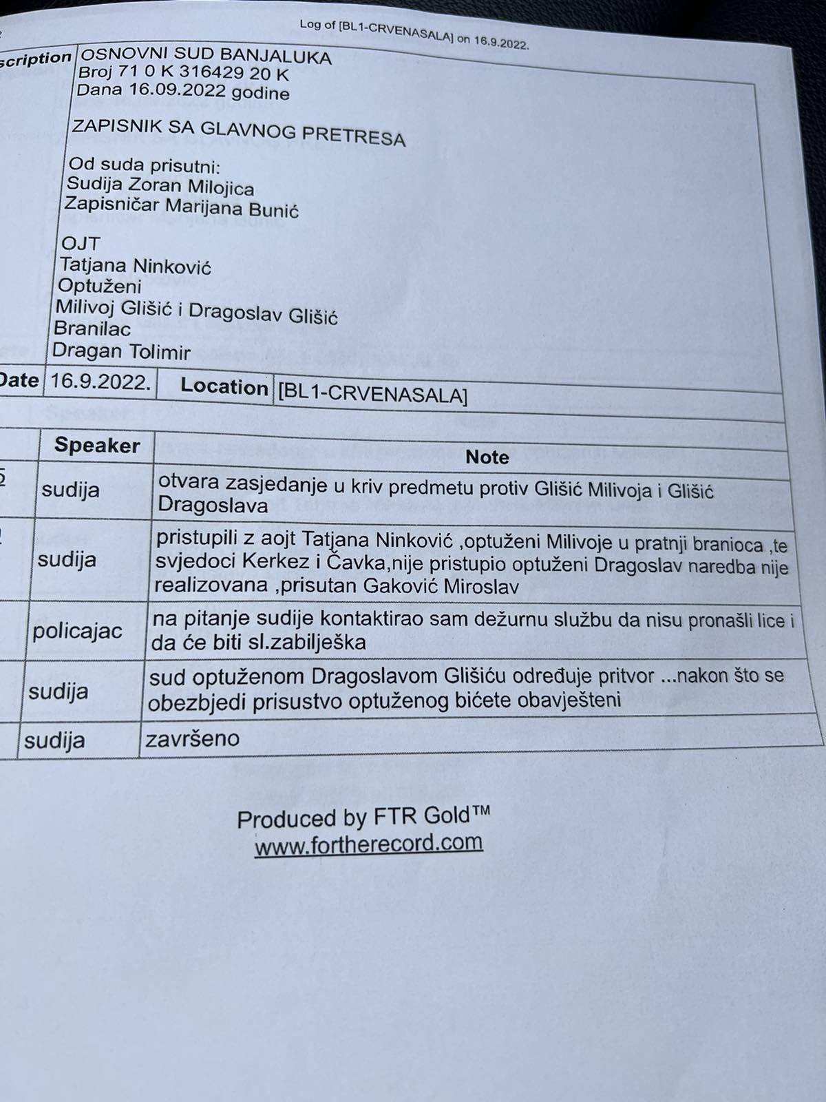 – Dakle, prijetnjom da će neposredno upotrijebiti silu, optuženi su spriječili službeno lice u institucijama Republike Srpske u vršenju službene radnje koju je preduzelo u okviru svojih ovlašćenja i ugrozili su sigurnost lica prijetnjom da će njega ili blisko lice lišiti života. Čime je osumnjičeni Milivoje Glišić učinio krivično djelo sprečavanje službenog lica u vršenju službene radnje, a osumnjičeni Dragoslav Glišić krivično djelo sprečavanje službenog lica u vršenju službene radnje u sticaju sa krivičnim djelom ugrožavanje sigurnosti – navodi se u optužnici.