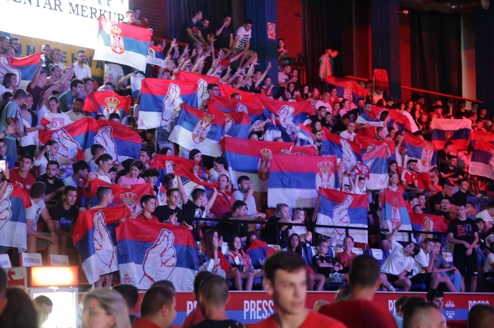 Sa srpskim navijačima u dvorani Borik je i predsjednik Republike Milorad Dodik sa saradnicima.