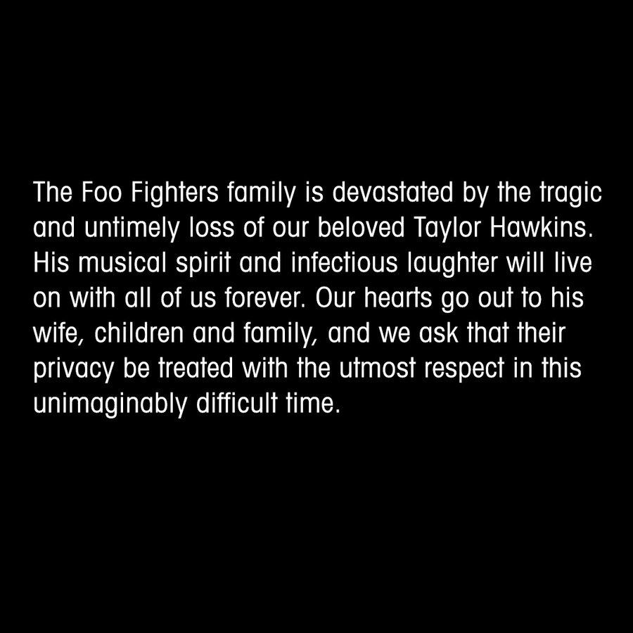 – Naša porodica je slomljena zbog tragičnog i preranog odlaska našeg voljenog Tejlora Hokinsa. Njegov muzički duh i zarazni smijeh živjeće s nama zauvijek. Naša srca su sa njegovom ženom, djecom i porodicom i tražimo da se prema njihovoj privatnosti postupa sa najvećim poštovanjem u ovom nezamislivo teškom vremenu – naveo je bend na Tviteru ne navodeći uzrok smrti, prenosi Rojters.