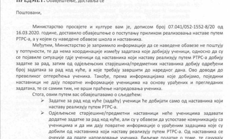 Ministarstvo je dobilo informaciju gdje učenici od nastavnika koji nastavu realizuju putem RTRS-a, dobiju zadatke za rad, zatim od odjeljenskih starješina/ predmetnih nastavnika dobiju određeni broj zadataka za rad kod kuće, a koje trebaju završiti do narednog dana. Ovo dovodi do prevelikog opterećenja učenika.
