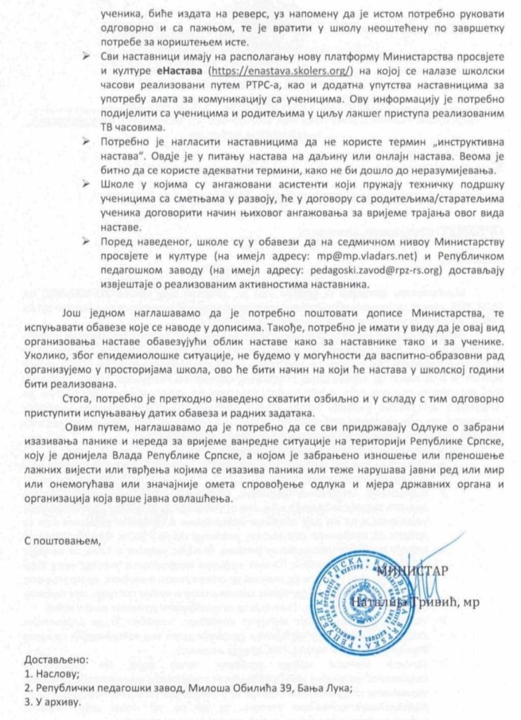 Učenici mogu dobiti zadaću samo od nastavnika koji realizuju nastavu preko RTRS-a