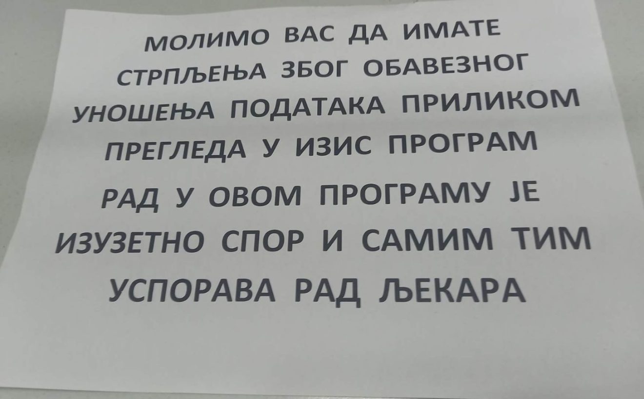 – Molimo vas da imate strpljenja zbog obaveznog unošenja podataka prilikom pregleda u IZIS program. Rad u ovom program je izuzetno spor i samim tim usporava rad ljekara – navedeno je u obavještenju za koje pacijenti tvrde da se nalazilo u Domu zdravlja Kozarska Dubica.