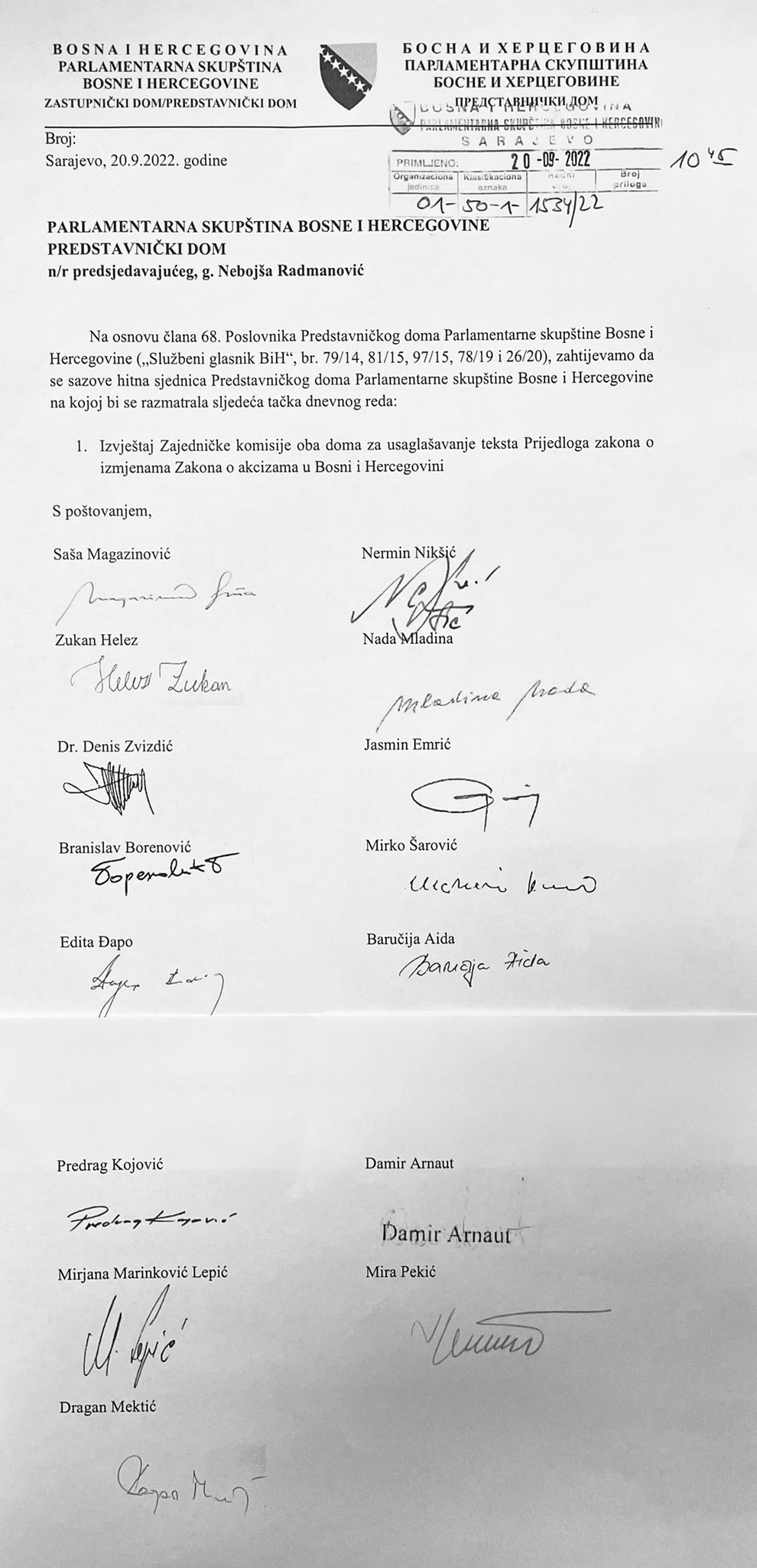 Sazivanje hitne sjednice Predstavničkog doma tražili su poslanici Saša Magazinović, Zukan Helez, Denis Zvizdić, Branislav Borenović, Edita Đapo, Predrag Kojović, Mirjana Marinković Lepić, Dragan Mektić, Nada Miladina, Nermin Nikšić, Jasmin Emrić, Aida Baručija, Damir Arnatut, Mirko Šarović i Mira Pekić.